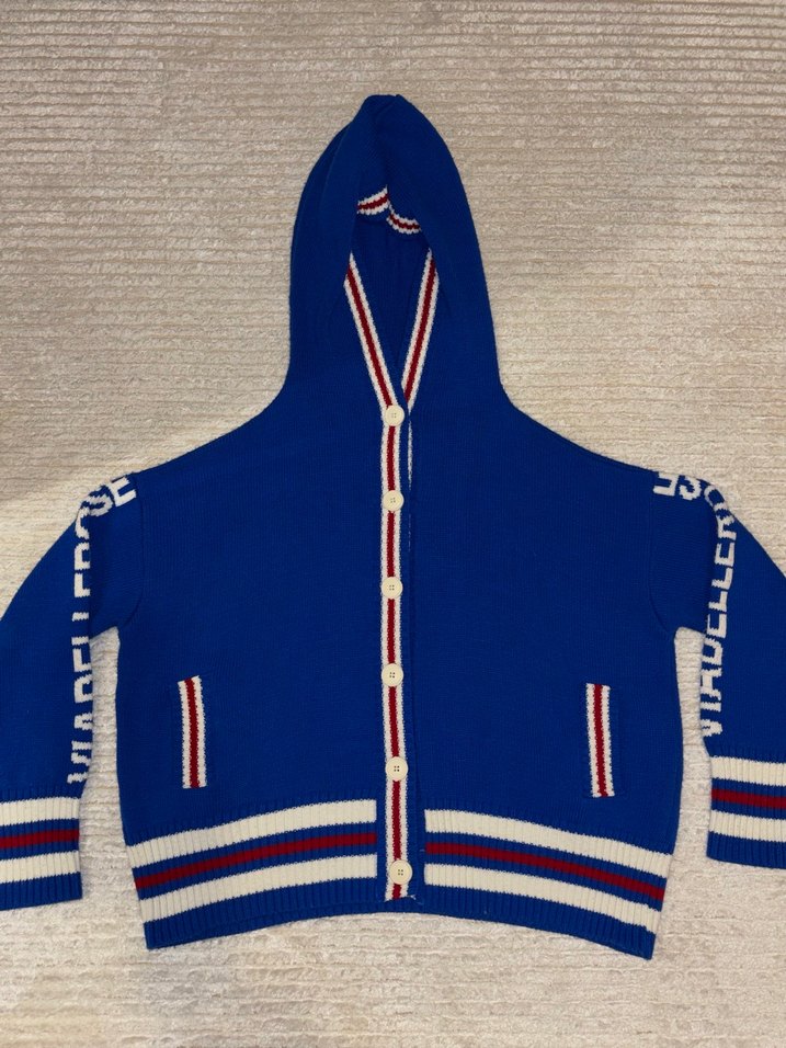 Kapüşonlu, uzun kollu, mavi renkli, kırmızı ve beyaz çizgili detaylara sahip, triko örgüden yapılmış kadın hırka. Rahat ve şık sokak stili için uygundur. Ürünün ölçüleri görselde belirtilmiştir. Defosu yoktur. Çoklu alımlarda indirim yapılabilir. Ürün hakkında herhangi bir sorunuz varsa mesaj atabilirsiniz