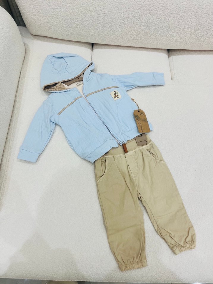 Pastel mavi kapüşonlu uzun kollu üst ve bej kemerli pantolondan oluşan yumuşak ve rahat bebek takımı. 100 pamuk beden sorunuz