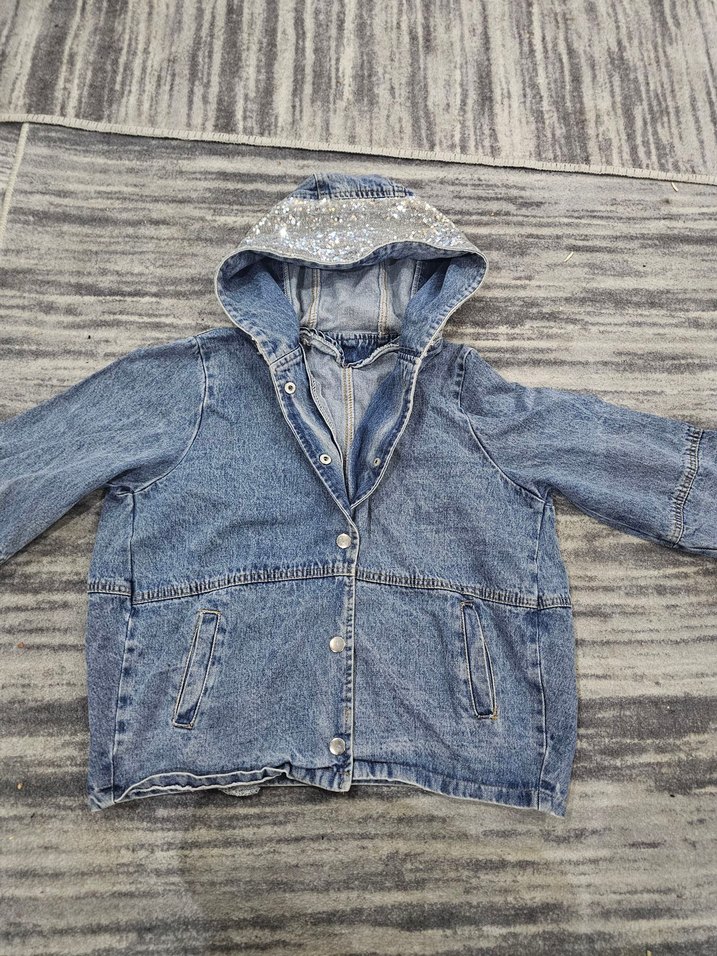 Kapüşonlu, düğmeli ve uzun kollu rahat kesim mini denim ceket. Düz mavi kumaştan, sokak modasına uygun rahat bir parça.