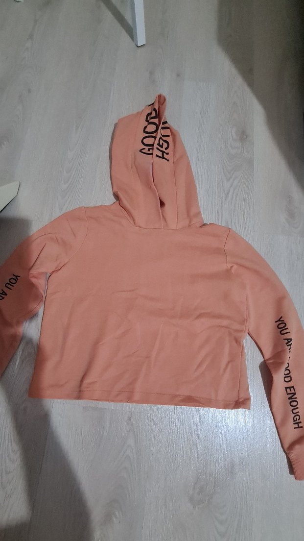 Pastel pembe renkte, kapüşonlu ve baskılı yazılı uzun kollu, kısa ve bol kesim sweatshirt. Yumuşak kumaştan, günlük kullanım için rahat ve şık bir parça.