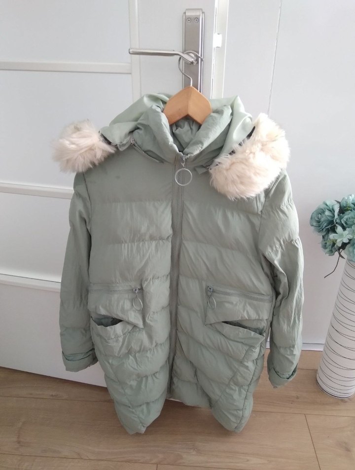 Temiz ve sorunsuz mint yeşili renkte, kapüşon detaylı,(kapşonu fermuarlı çıkıyor ) yumuşak kumaştan yapılmış, 85 cm boyunda,koltukaltından diğer koltukaltına ölçüsü 53 cm ölçüsünde kadın kışlık mont.