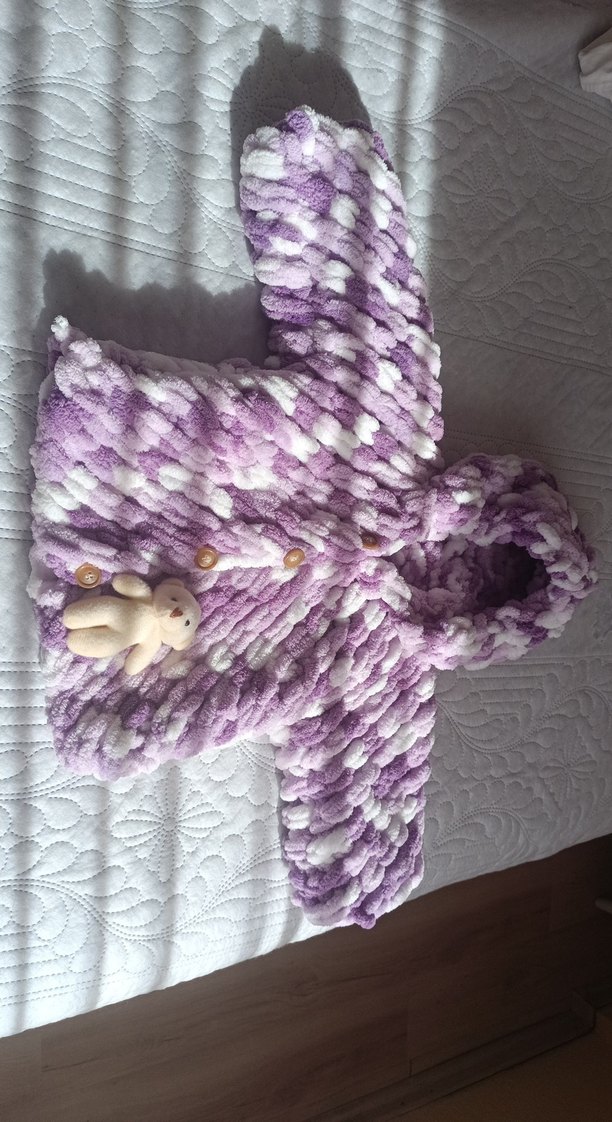 Kapüşonlu, mor tonlarında pastel renkli, örgü bebek kız tulumu. Bağlamalı düğmeler ve küçük bir oyuncak ayı süsü bulunur. El örgüsü sipariş kabul edilir.