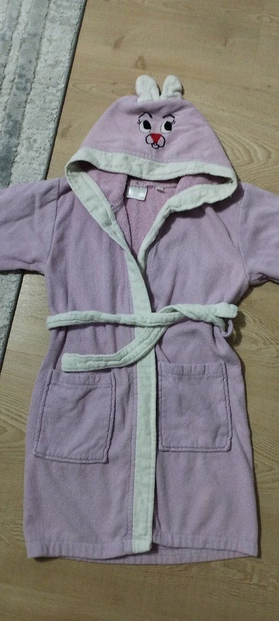 Pastel mor renkte, kapüşonlu çocuk bornozu. Yumuşak ve sıcak kumaş, tavsan işlemeli, kulaklı kapüşon ve iki ön cepli. Belden bağlamalıdır. 4 yaştan 7 yaşa kadar kullanım sağlar