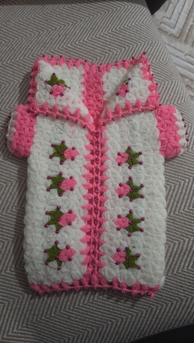 Kapüşonlu, uzun kollu, nakışlı çiçek desenleriyle pastel renklerde bohem tarzda, triko kız çocuk yeleği.