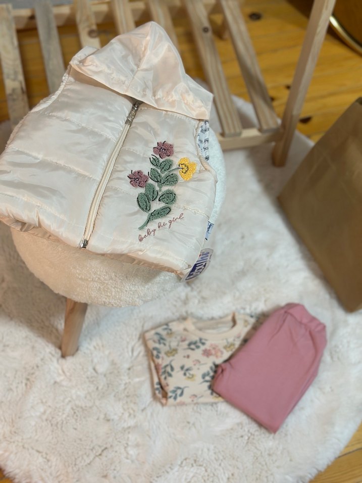 Kapüşonlu, fermuarlı, beyaz kız yeleği, pastel renkli çiçek nakışlıdır. Sentetik kumaştan, bol kesimdir. 1 adet mevcut 9-12 ay