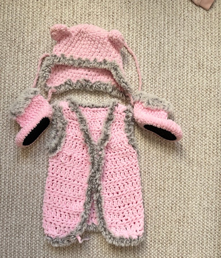 Pembe ve gri nakışlı detaylara sahip örgü bebek tulumu. Kulaklı kapüşon ve eldivenlerle tamamlanmıştır.