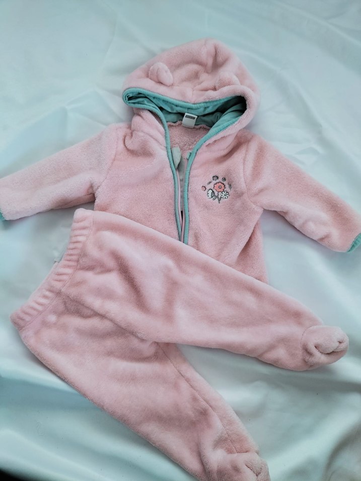 Pastel pembe renkli, kapüşonlu ve nakışlı bebek tulumu. Fermuarlı önü ve yumuşak, sıcak kumaşıyla rahatlık sağlar. ❄️ 3-6 ay bebek takımı