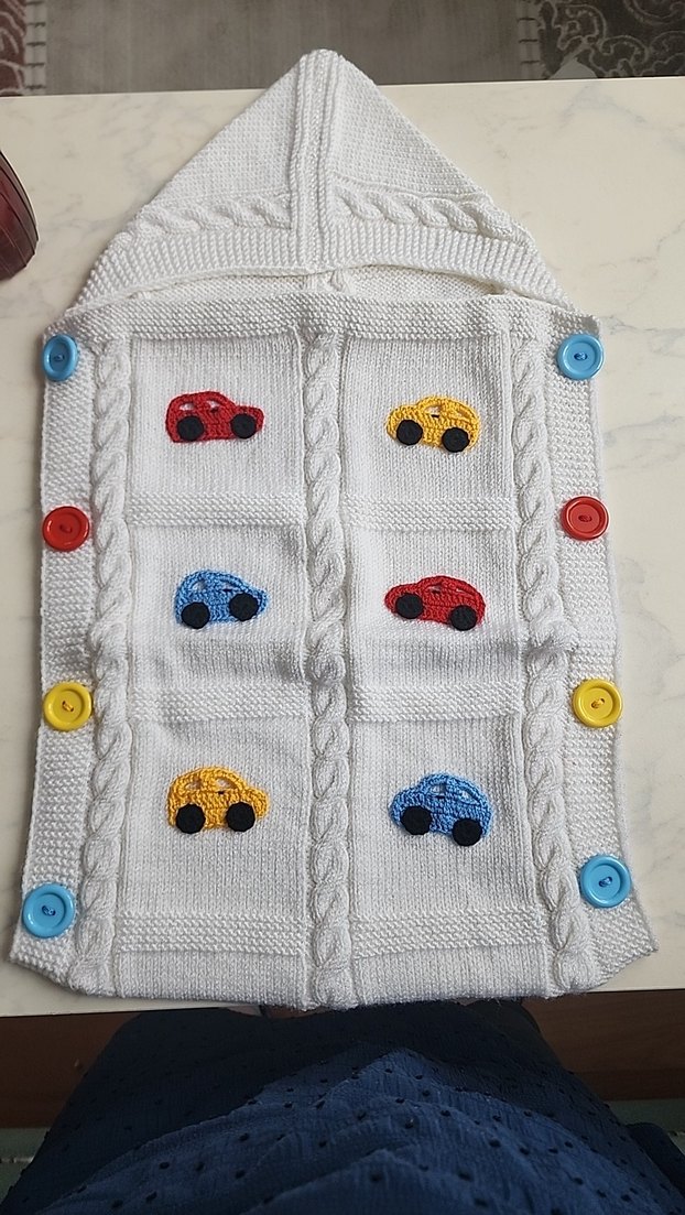Beyaz renkte, kapüşonlu örgü çocuk battaniyesi. Üzerinde renkli nakışlı araba desenleri ve farklı renklerde düğmeler bulunur. Kaliteli Alize antialerjik iplerle örüldü.