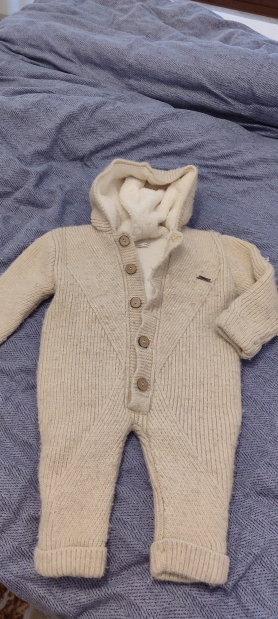 Kapüşonlu, düğmeli ve yumuşak astarlı örgü bebek tulumu, bej tonlarında. Sıcak tutar. 9-12 ay bebekler için .