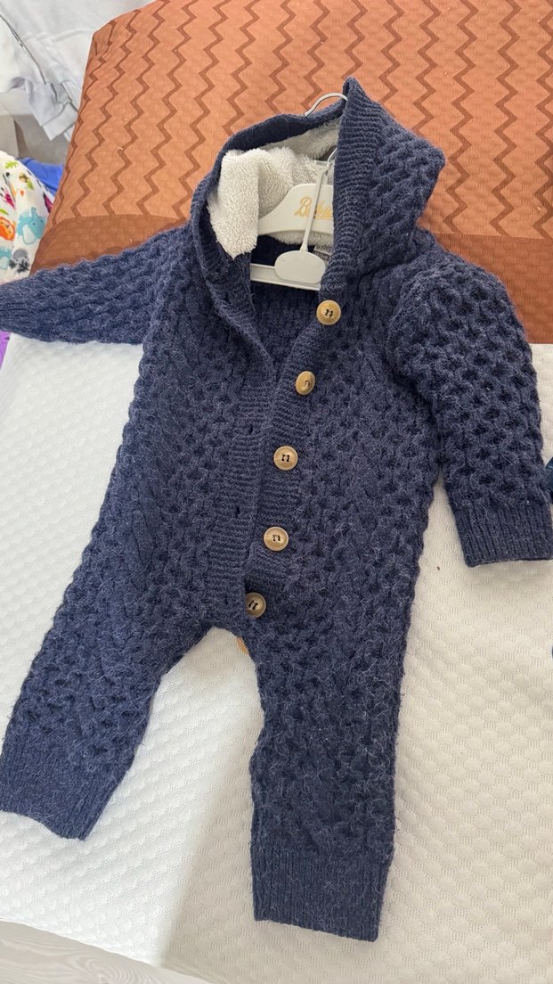 Kapüşonlu, düğmeli koyu gri örgü bebek tulumu, sıcak ve rahat bir dokuya sahiptir.
