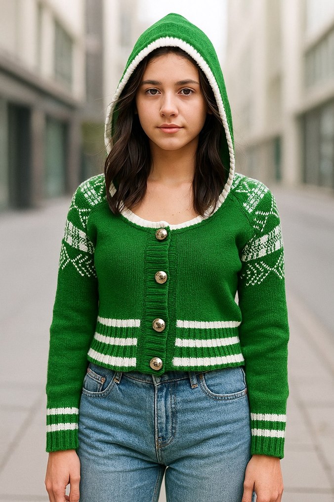 Yeşil örgü hırka, kapüşonlu ve uzun kolludur. Salaş kesim, yuvarlak yaka ve düğmeli ön detaylara sahiptir. Midi uzunluk, rahat ve günlük bir stil sunar.