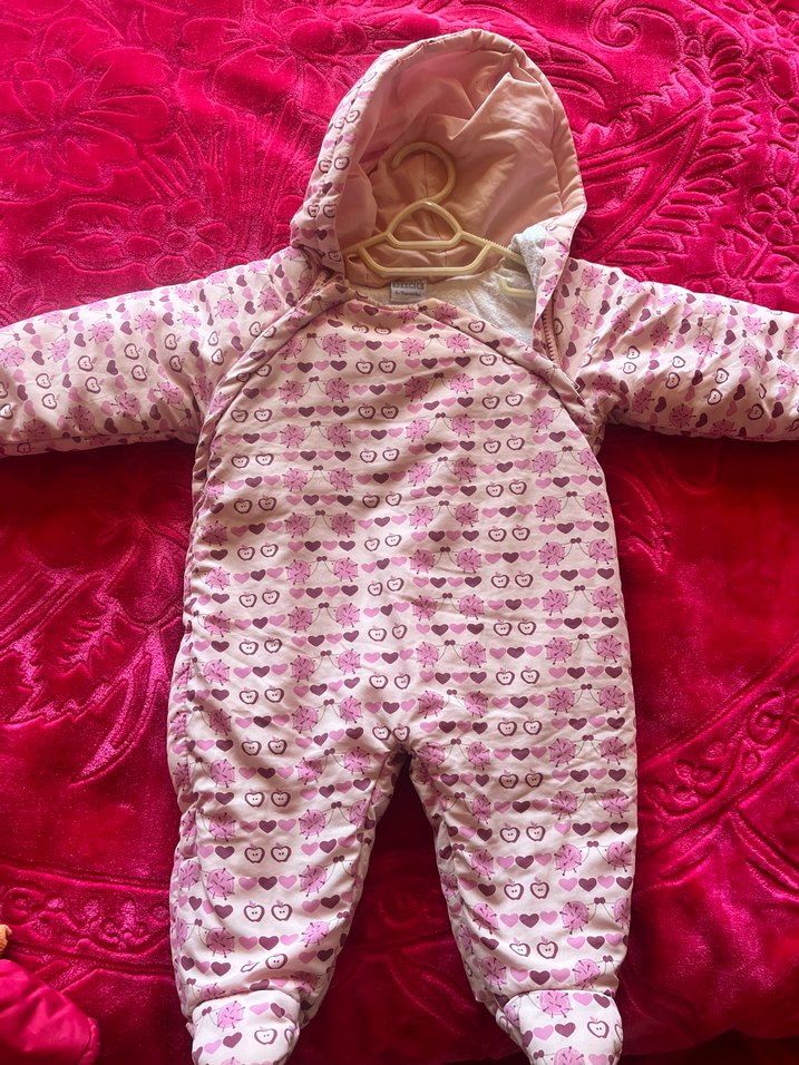 Kapüşonlu, örgü dokulu ve renkli desenlere sahip pembe kız bebek tulumu, sıcak tutar ve konfor sağlar. ❄️ 6/9 ay uygun