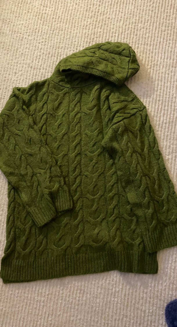 Yeşil renkli, kapüşonlu ve uzun kollu örgü kadın kazak, bol kesimiyle rahat ve desensiz tasarıma sahiptir.