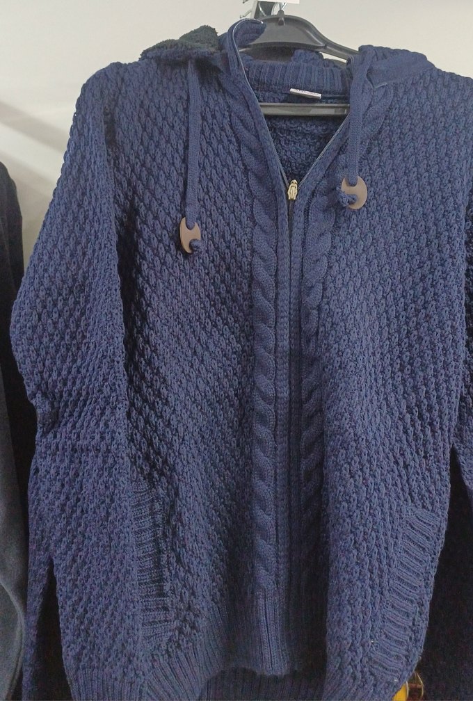 Lacivert örgü kadın kazak, kapüşonlu ve uzun kolludur. Rahat vkesimiyle günlük sokak stiline uygundur. Midi boyda ve desensizdir. L beden ancak M bedene rahat olur dar kalip