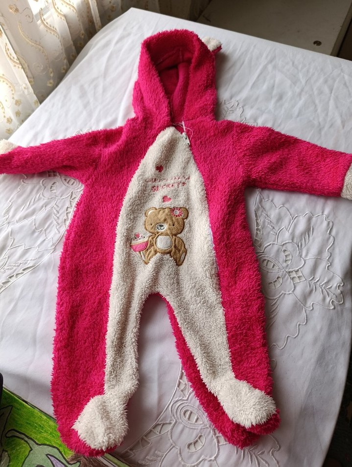 Kapüşonlu yakalı, yumuşak örgü kumaştan yapılmış bebek tulumu. Ön kısmında renkli nakış ayıcık deseni bulunur, sıcak ve sevimli tasarım sunar.