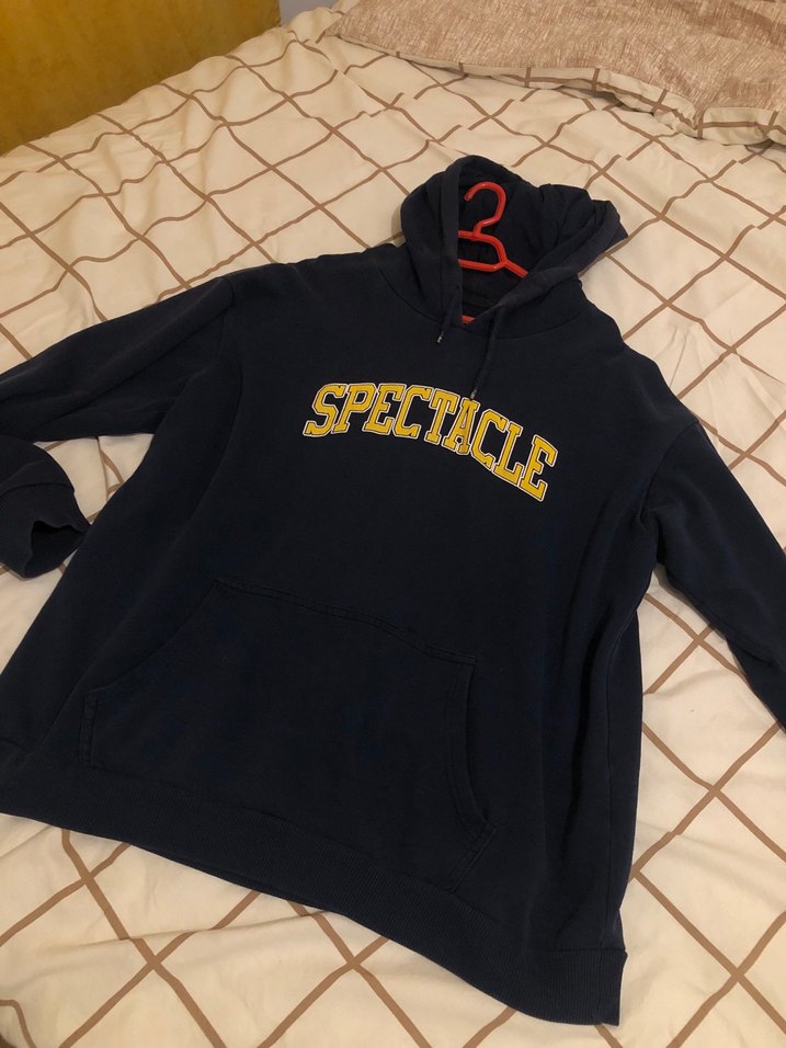 Uzun kollu, kapüşonlu siyah oversize sweatshirt, üzerinde "SPECTACLE" baskısı ve yırtmaç detayı bulunur. Midi boyda, rahat kesimdir.