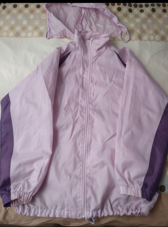 M beden , Sentetik kumaştan yapılmış, kapüşonlu ve fermuarlı, pastel mor ,Lila renkli, fitted kesim yağmurluk.içi astarlıdır.temiz kullanıldı.