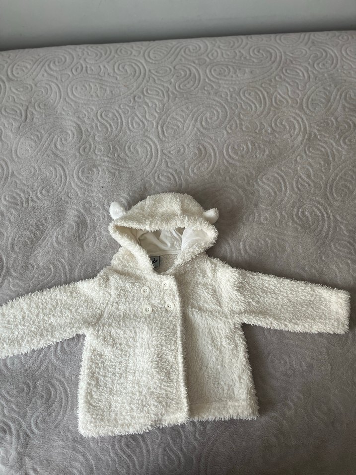 Kapüşonlu, kulak detaylı yumuşak peluş kumaştan yapılmış, beyaz renkli,çocuk ceketi.