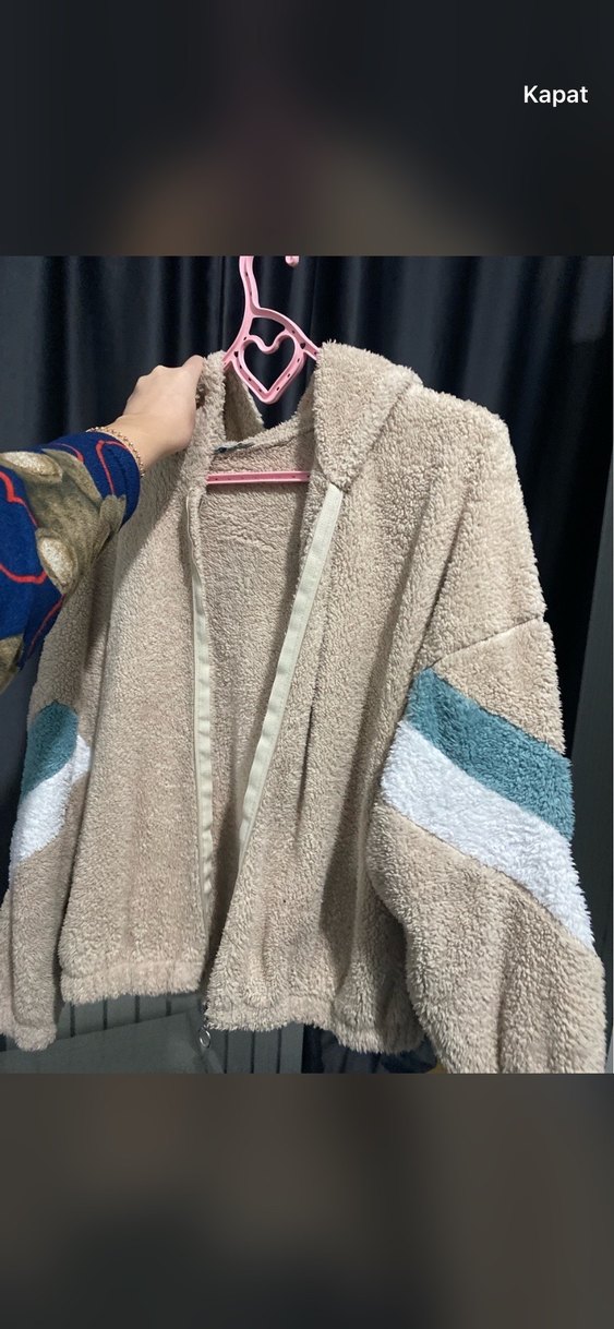 Bej kapüşonlu ceket, yumuşak peluş kumaş ve uzun kollara sahip. Pastel mavi ve beyaz detaylı, rahat ve salaş kesim, günlük sokak stili için uygun. Sorunsuz