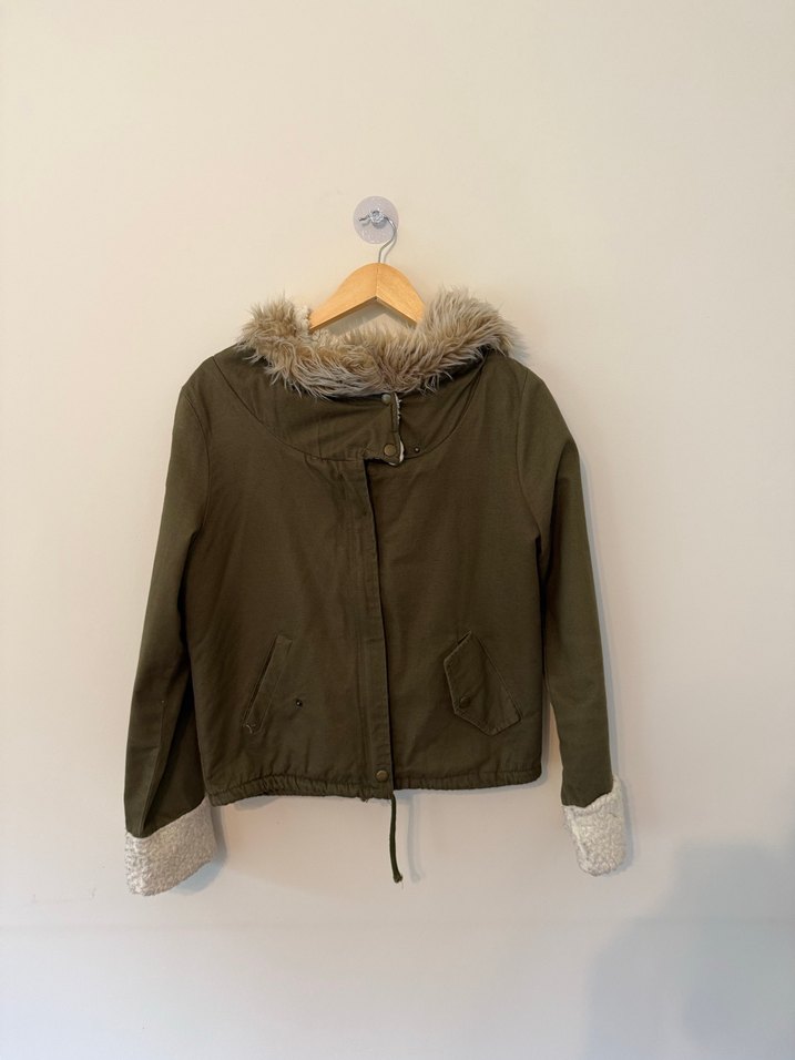 Kapüşonlu, peluş detaylı, uzun kollu, normal uzunlukta, bol kesim kadın ceketi. Yumuşak ve sıcak kumaş, dış mekan kullanımı için uygun. Desensiz ve rahat tarzda.