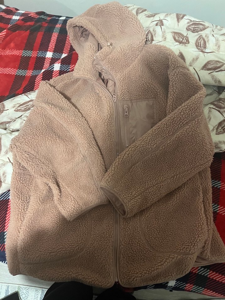 Kahverengi, kapüşonlu, peluş kumaştan yapılmış, uzun kollu ve bol kesim kadın ceket. Fermuarlı ve günlük kullanıma uygun. gülkurusu