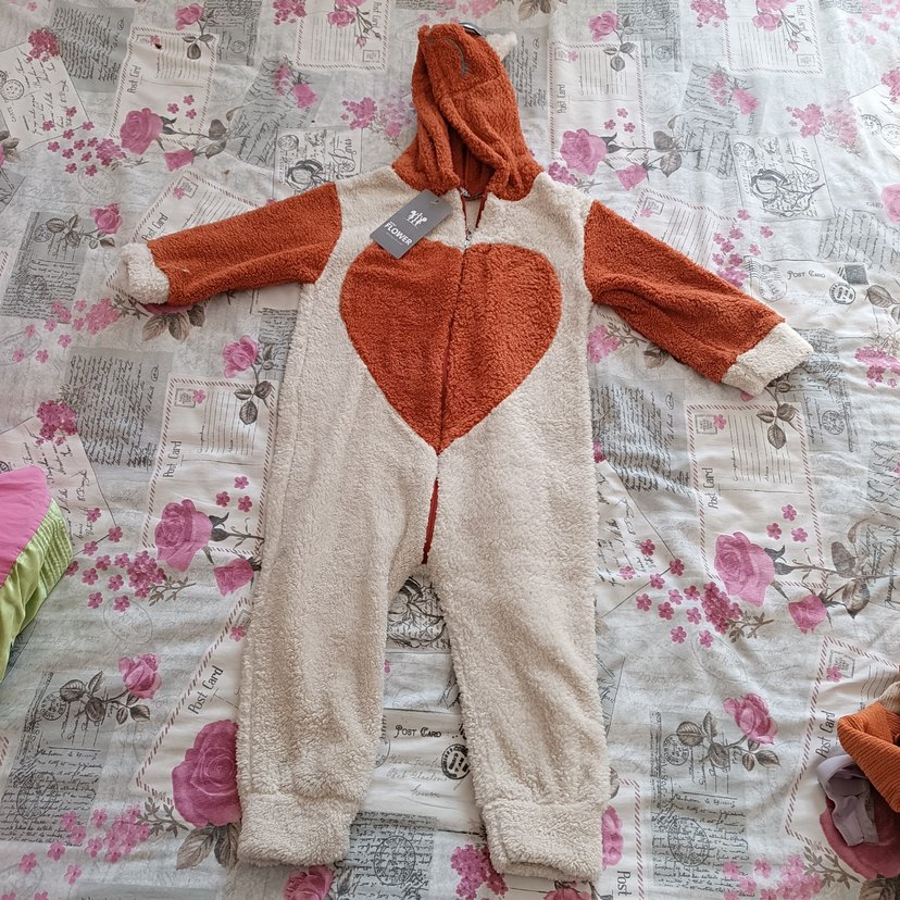 Kapüşonlu, peluş kız tulumu, önünde büyük kalp deseni bulunur. Kahverengi tonlarıyla sıcak bir görünüm sunar. ❄️