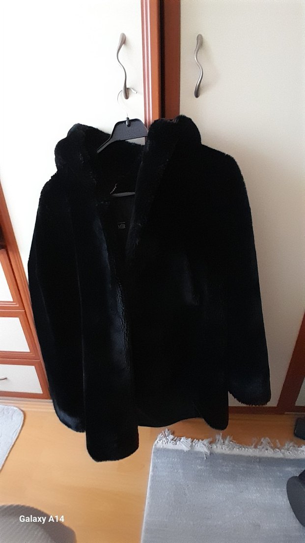 Siyah, uzun kollu, kürk detaylı midi boy, rahat kesim kadın mont. Yumuşak ve sıcak kumaştan, gündelik kullanıma uygun.