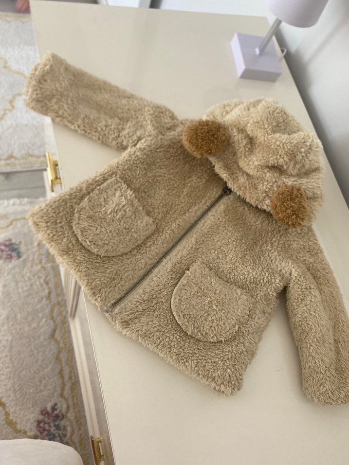 Kız çocukları için kapüşonlu, bol kesim bej peluş mont. Kapüşonda kürk detayları ve ön cep bulunur, fermuarlı kapama sağlar.