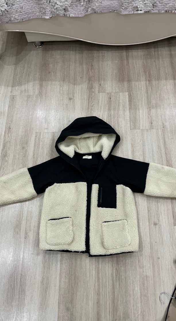 Kapüşonlu, bol kesim unisex çocuk kabanı, siyah ve krem renklerde, yumuşak tüylü pelüş ve kumaş detaylarıyla sokak stiline uygun.9 yaş