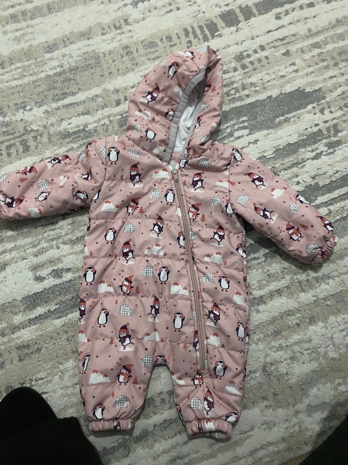 Kapüşonlu, kürklü detaylı, pembe baskılı bebek tulumu. Önden fermuarlı ve lastikli manşetlere sahip.