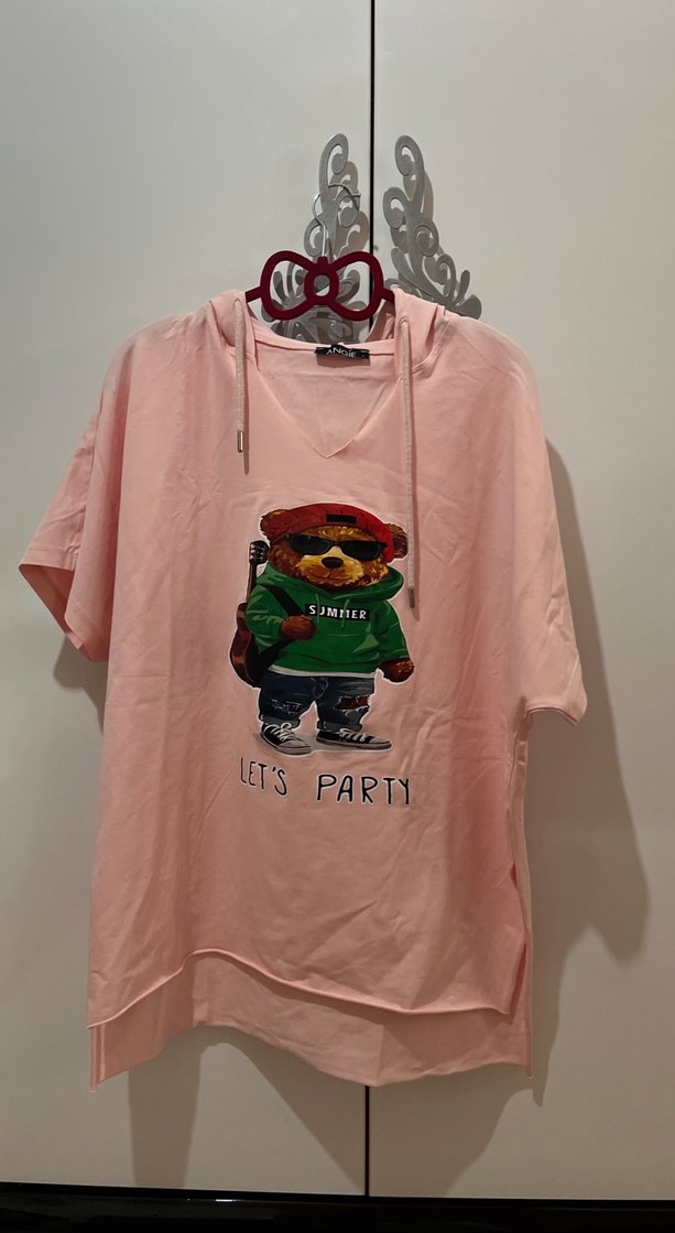 Yumuşak ve sıcak kumaştan, kapüşonlu, kısa kollu, bol kesim pembe tişört. Üzerinde baskılı ayı ve "LET'S PARTY" yazısı bulunuyor. Çoğu bedenle uyumlu