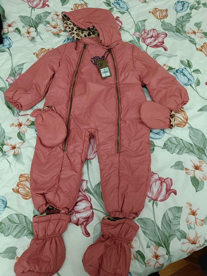 Kapüşonlu ve çift fermuarlı pastel pembe bebek kayak tulumu, uyumlu eldiven ve patiklerle. İç kısmı leopar desenli astarlı. ❄️