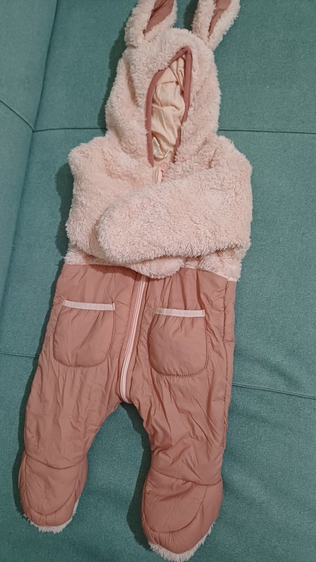 Pastel pembe renkte, kapüşonlu bebek kız tulumu. Üst kısmında yumuşak kürk detayları bulunur. Düz desensiz, ön cepli ve fermuarlı modeldir. ❄️
