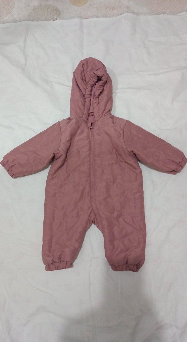Pastel pembe renkte, kapüşonlu ve önden fermuarlı bebek tulumu. Sade ve desensiz tasarımıyla soğuk havalar için uygundur. ❄️