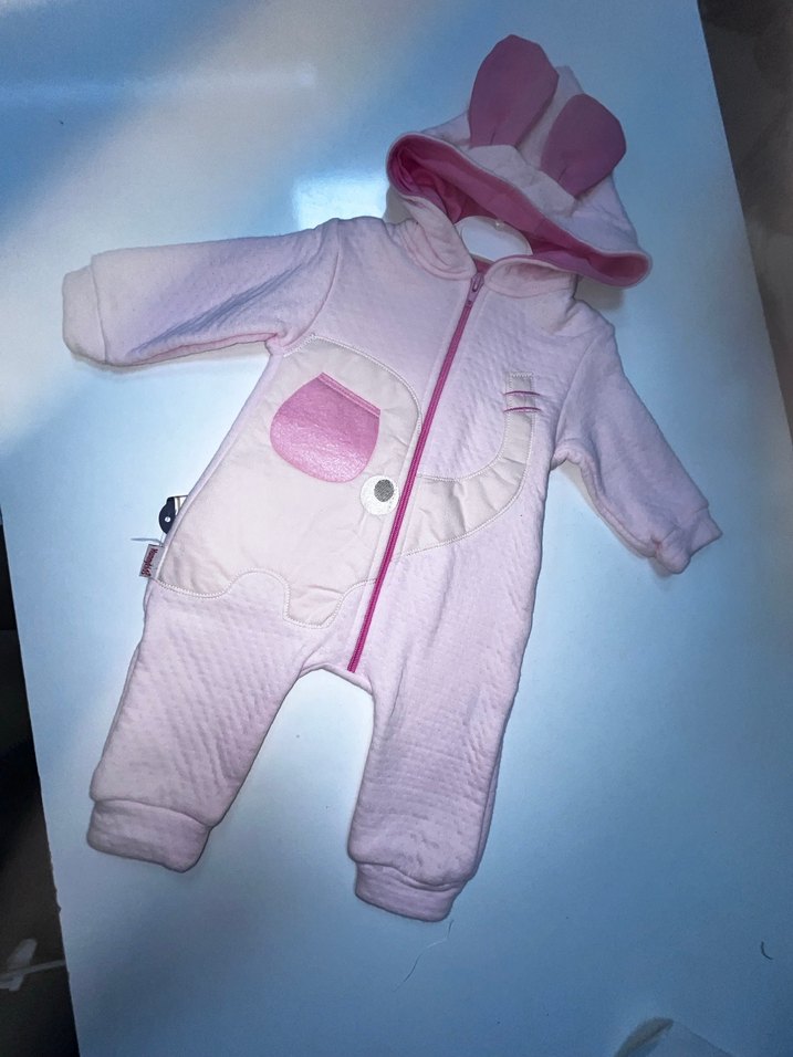 Kapüşonlu ve fermuarlı, pastel pembe renkte, sevimli kulaklı bebek tulumu. Yumuşak dokulu ve küçük cepli, bebeğinizi sıcak tutar.
