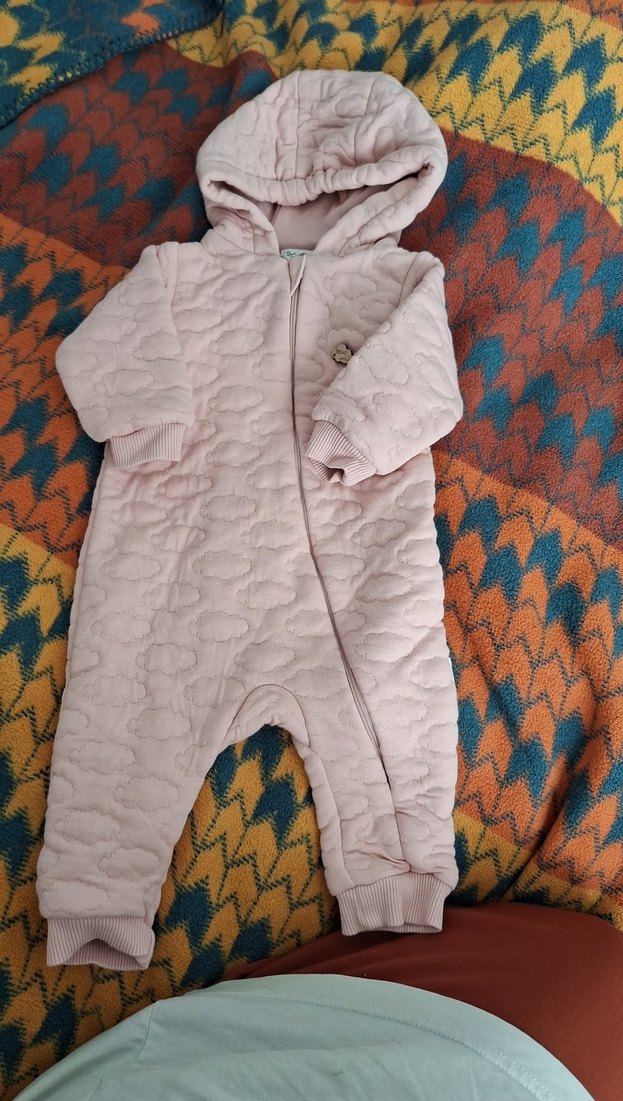 Pastel pembe kapüşonlu bebek tulumu, örgü dokusu ile sıcak tutar. Fermuarlı ve manşetli rahat uyum sağlar. ❄️ Sadece 1 defa giyildi sıfır ayarında hiçbir sorunu yok .