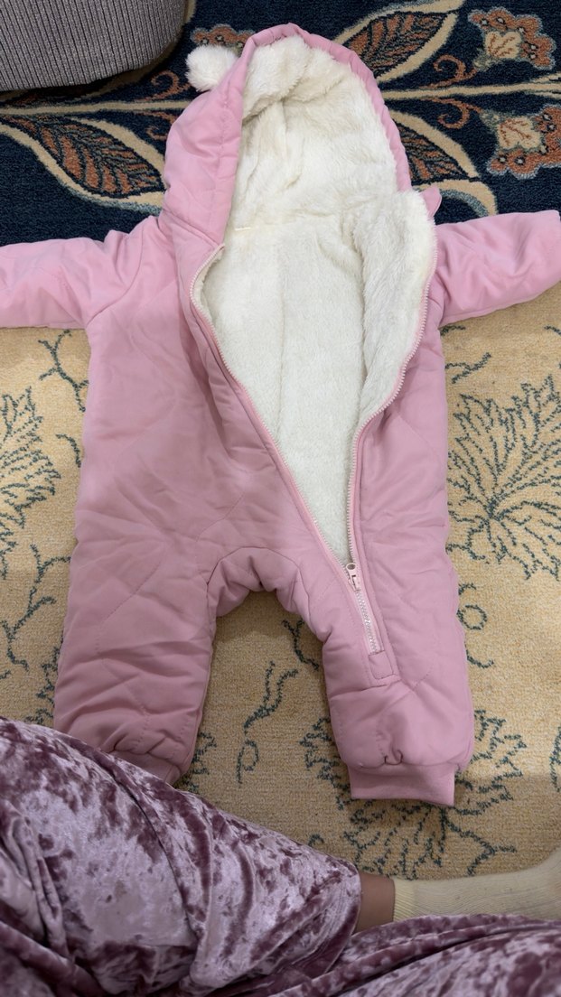 Kapüşonlu, kürk detaylı pembe bebek tulumu, fermuarlı ve desensiz tasarıma sahiptir. Bebeğinizi sıcak tutmak için uygundur. ❄️