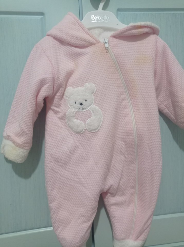 Kapüşonlu, pastel pembe bebek tulumu, manşetlerde yumuşak kürk detayları ve önünde nakışlı ayıcık deseni bulunur. Sıcak ve rahat. Sarı lekeler var yikiyinca çıkar bikere giyildi