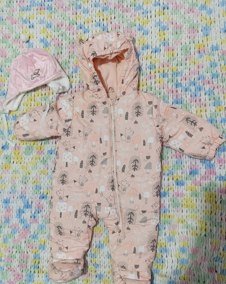 Pastel pembe renkte, kapüşonlu, desenli bebek tulumu, 1-3ay 1kere giyildi