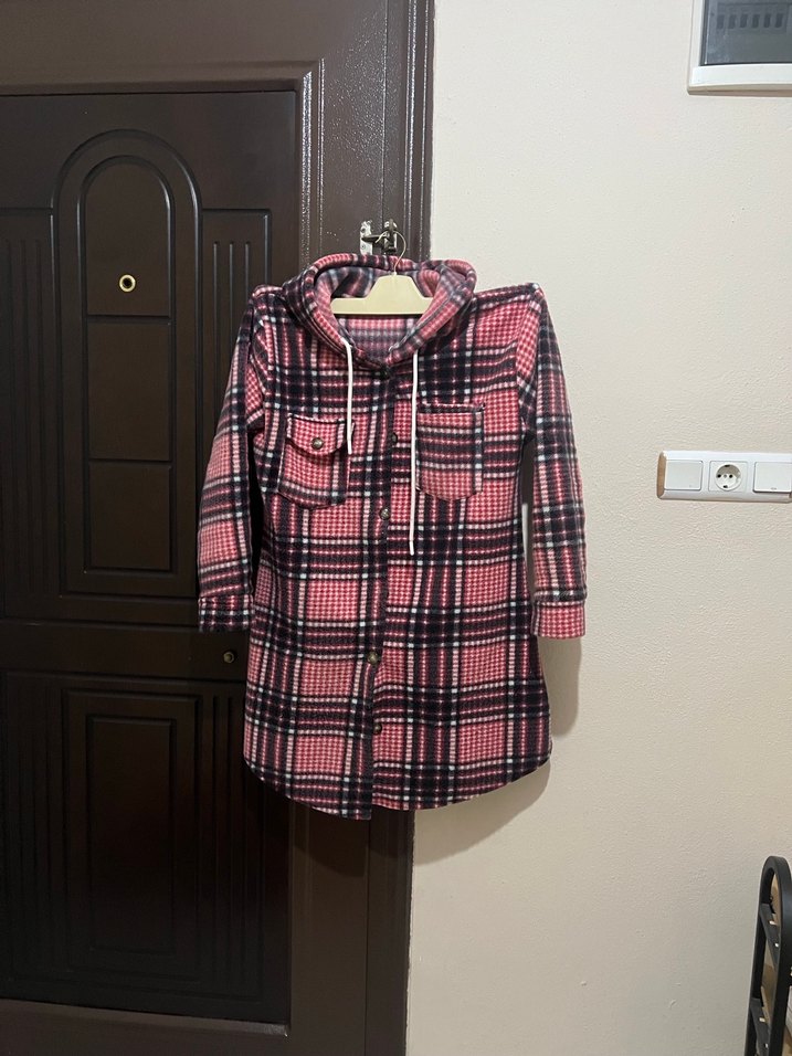 Koyu pembe ekose desenli gömlek, uzun kollu, kapüşonlu ve düğmeli ön kısmıyla dikkat çeker. Rahat kesim ve midi boyda, yumuşak ve sıcak kumaştan üretilmiştir.