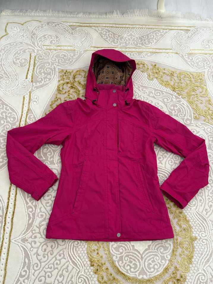 Pembe kapüşonlu kadın ceketi, fermuarlı ön ve uzun kolludur. Rahat kalıbı ve sentetik kumaşıyla dış mekan kullanımı için uygundur.