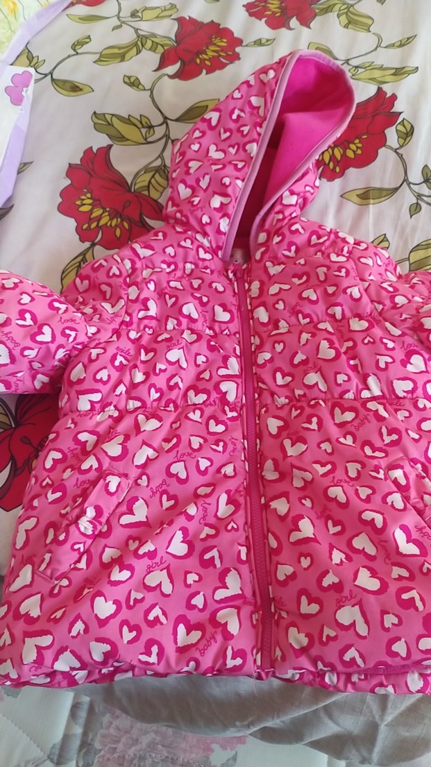 Kapüşonlu ve fermuarlı, renkli kalp desenli pembe kız montudur. Yumuşak ve sıcak kumaştan yapılmıştır, sokak tarzı için uygundur.