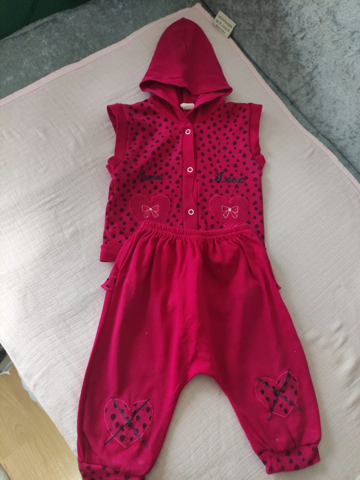 Kapüşonlu, düğmeli, kalp desenli pembe kız bebek takımı. Renkli ve rahat tasarım. 0-6 ay uygundur Deforme yoktur