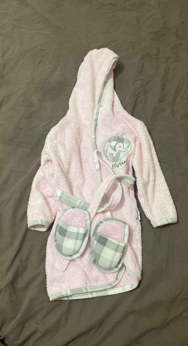 Pastel pembe kapüşonlu kız bornozu, fil desenli ve yumuşak kumaştan. Yanında uyumlu terlikler bulunur.