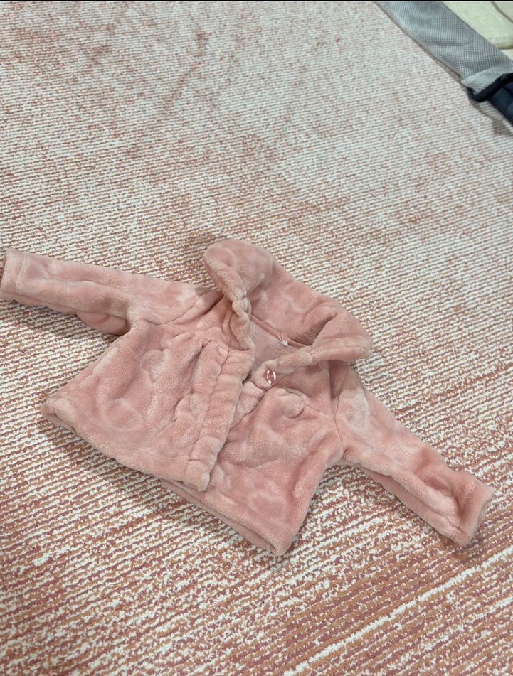 Kapüşonlu, pembe renkte, yumuşak peluş kumaştan yapılmış bol kesim kız çocuk ceketi. Sade ve pastel tonlarda, kürk detaylıdır.