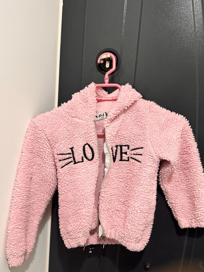 Kapüşonlu, bol kesim pembe kız çocuk ceketi, yumuşak peluş kumaş ve kürk detaylıdır. Üzerinde 'LOVE' baskısı bulunur, trend sokak stili için uygundur.