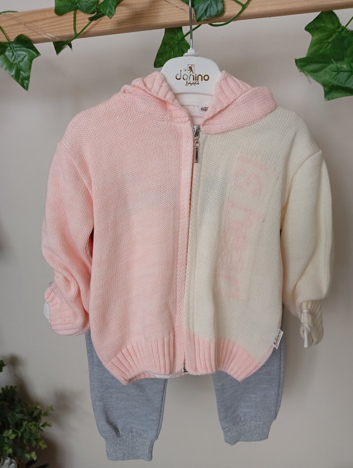 Uzun kollu, kapüşonlu, triko kumaştan, pembe ve krem renk bloklu kız çocuk hırkası. Bol kesim ve fermuarlı. Marka: Donino.