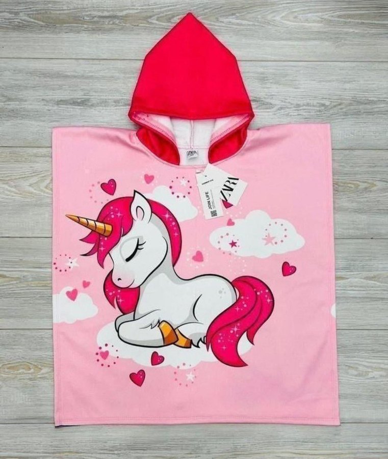 Kapüşonlu, uzun kollu pembe kız çocuk panço, renkli unicorn baskılı, yumuşak ve örme dokulu kumaştan, rahat bol kesim. 62x62 cm 2-8 yaş aralığına uygundur