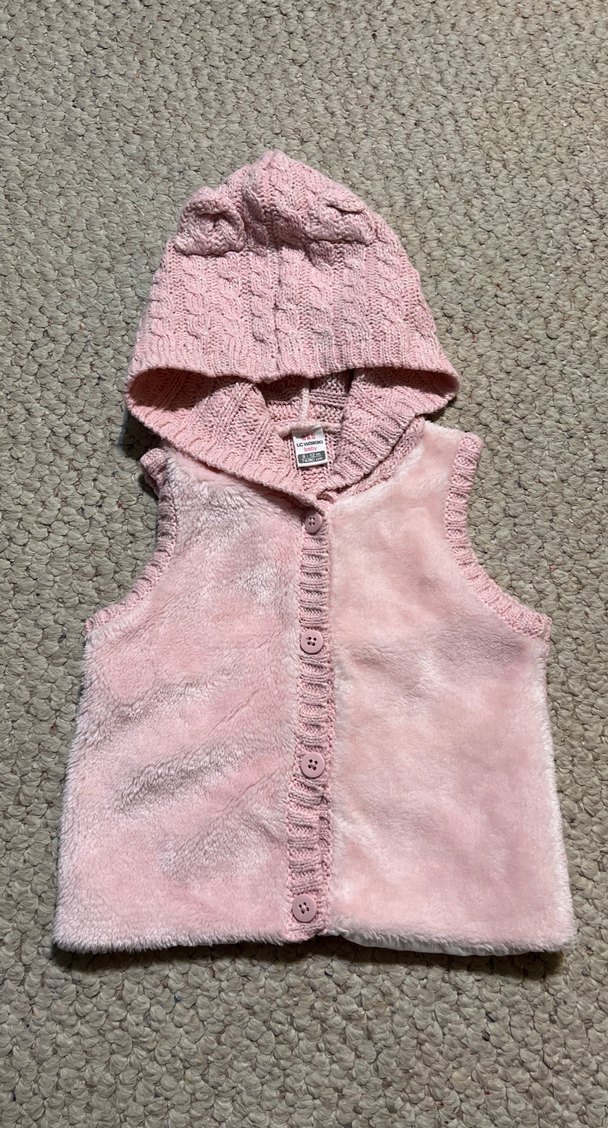 Yumuşak pembe örgü kapüşonlu, düğmeli, kolsuz ve tüylü dokulu kız çocuk yeleği, rahatlık ve sıcaklık sağlar.