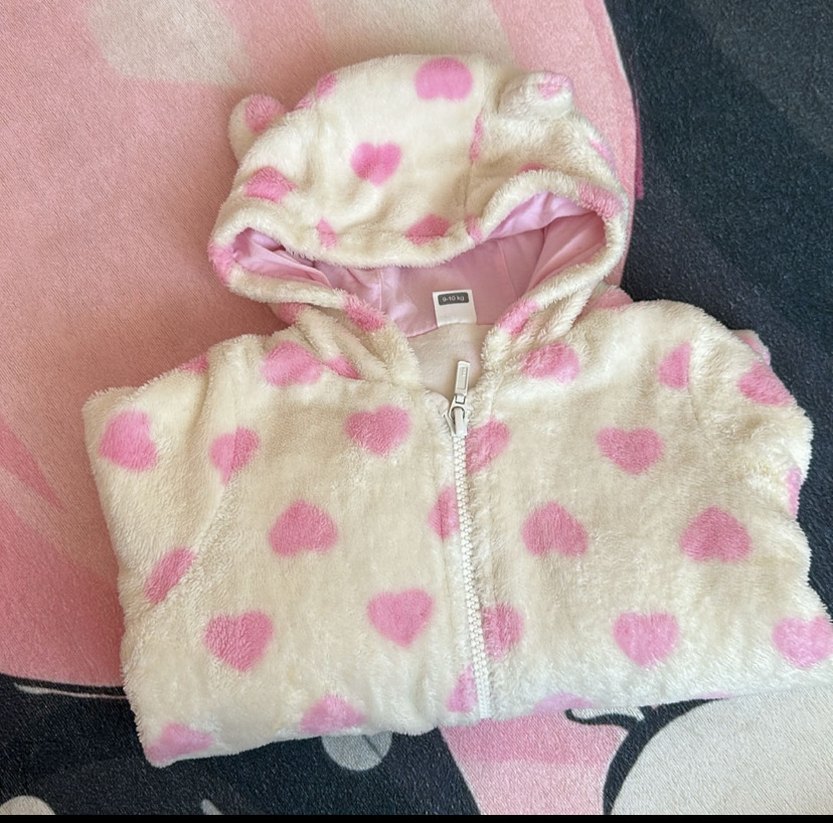 Kapüşonlu, yumuşak kürk detaylı bebek kız tulumu. Pastel pembe renkte ve kalp desenlidir, sıcaklık ve konfor sağlar.❄️